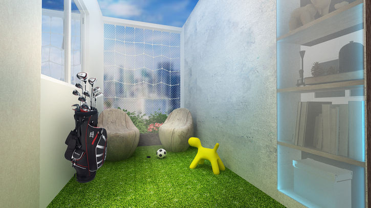 the balcony behind has an elongated layout that serves as an outdoor playground for both the daughter to play soccer and father to play golf casually on the grass that mimics its original outdoor field setting.